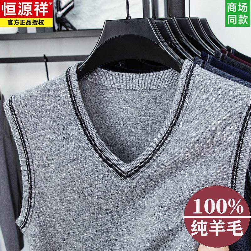 恒源祥100%纯羊毛衫男士V领背心秋冬薄款中年针织衫毛衣爸爸马甲