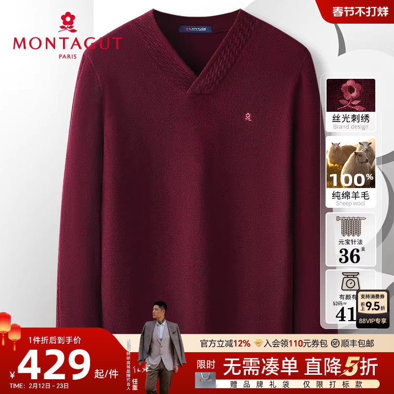 [100%绵羊毛/绞花领]梦特娇秋冬男士纯羊毛衫V领保暖针织毛衣厚J