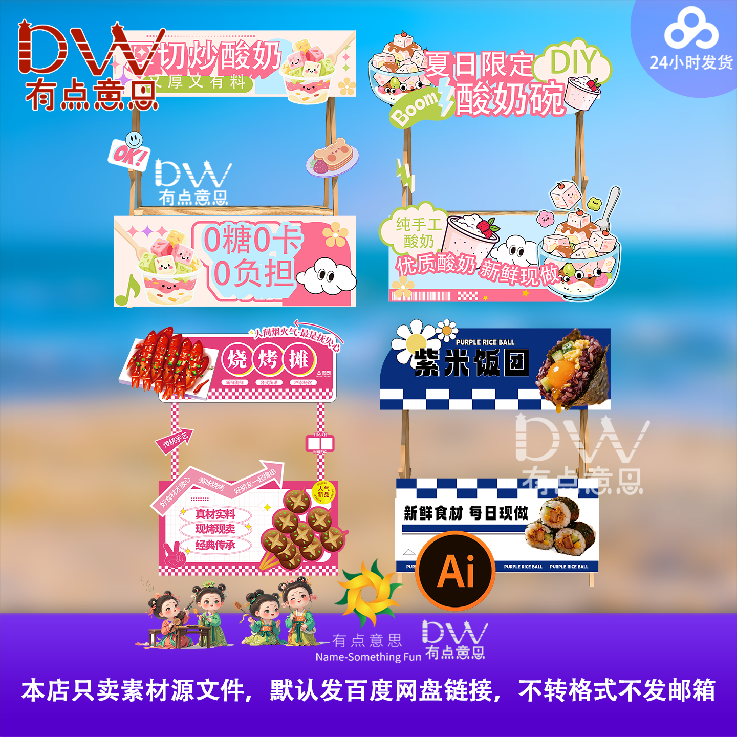 炒酸奶紫米饭寿司烧烤集市摊位卡通可手绘美食招牌设计素材小吃车