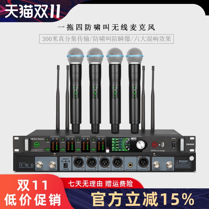 无线一拖四麦克风动圈大音量舞台ktv防啸叫户外家庭功放万能话筒