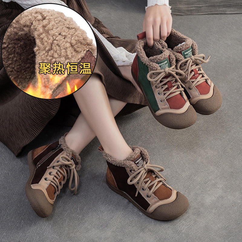 且朴头层牛皮复古高帮鞋女2025双拉链羊羔绒短靴休闲马丁靴雪地靴
