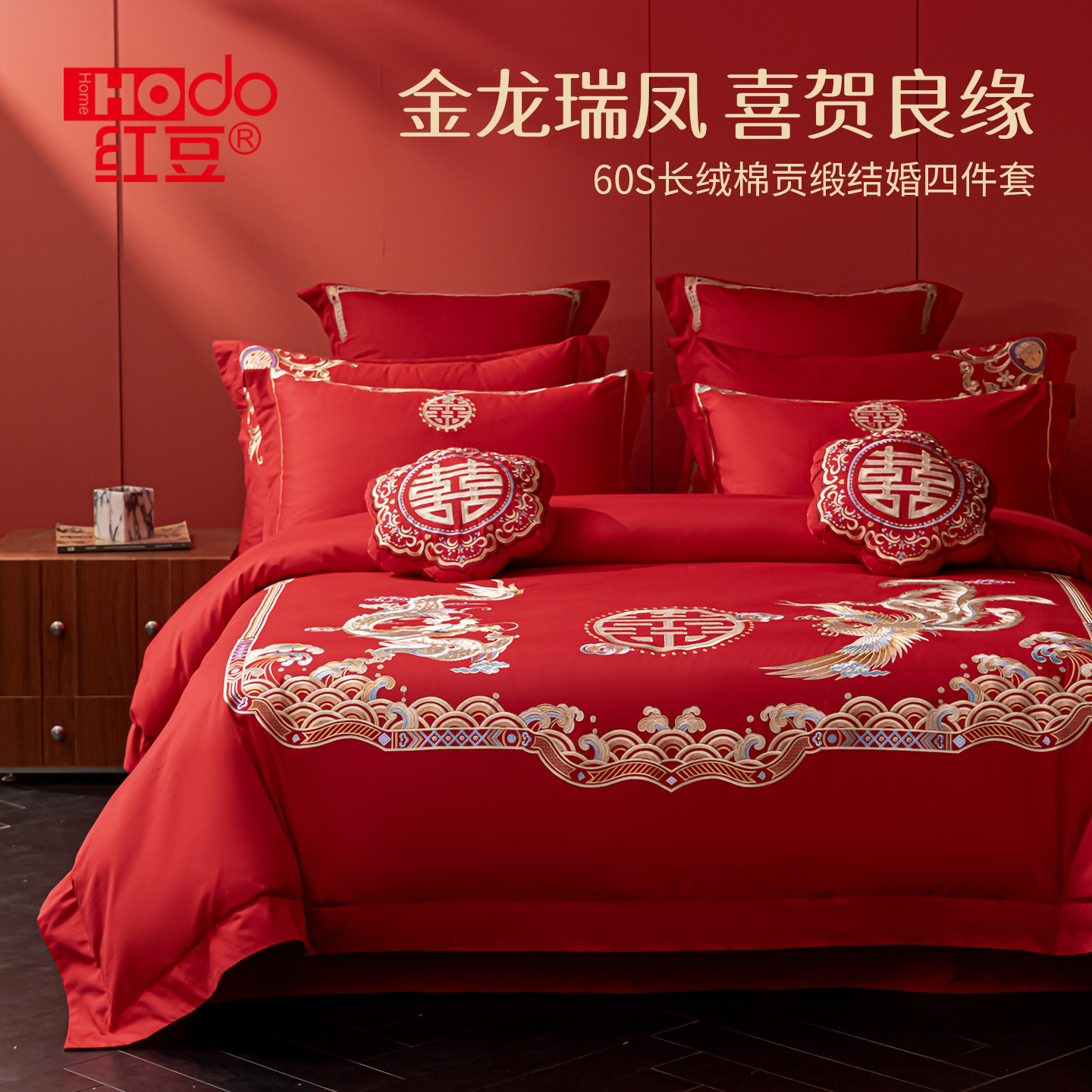 红豆高端婚庆四件套全棉喜庆结婚龙凤纯棉婚嫁婚床新婚大红喜被套