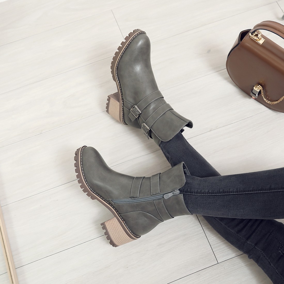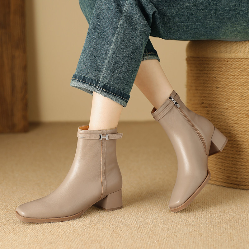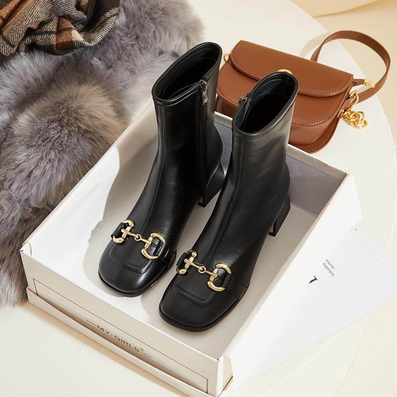 韩版方头中跟粗跟短靴女春秋单靴真皮羊皮冬季加绒侧拉链时装女靴