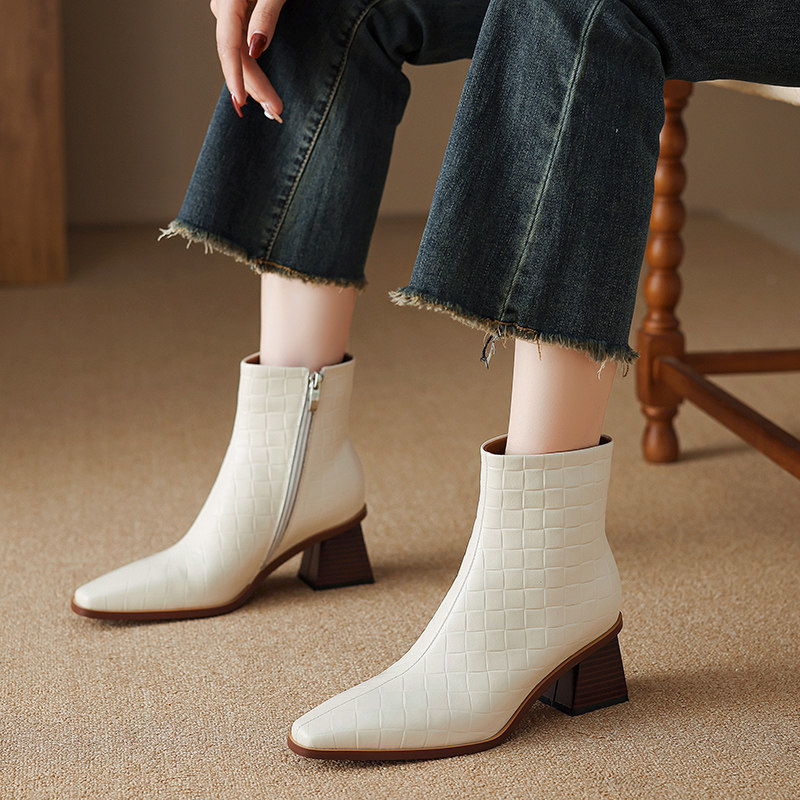 韩版方头真皮压花皮粗跟时装短靴女春秋冬季单靴侧拉链中高跟裸靴