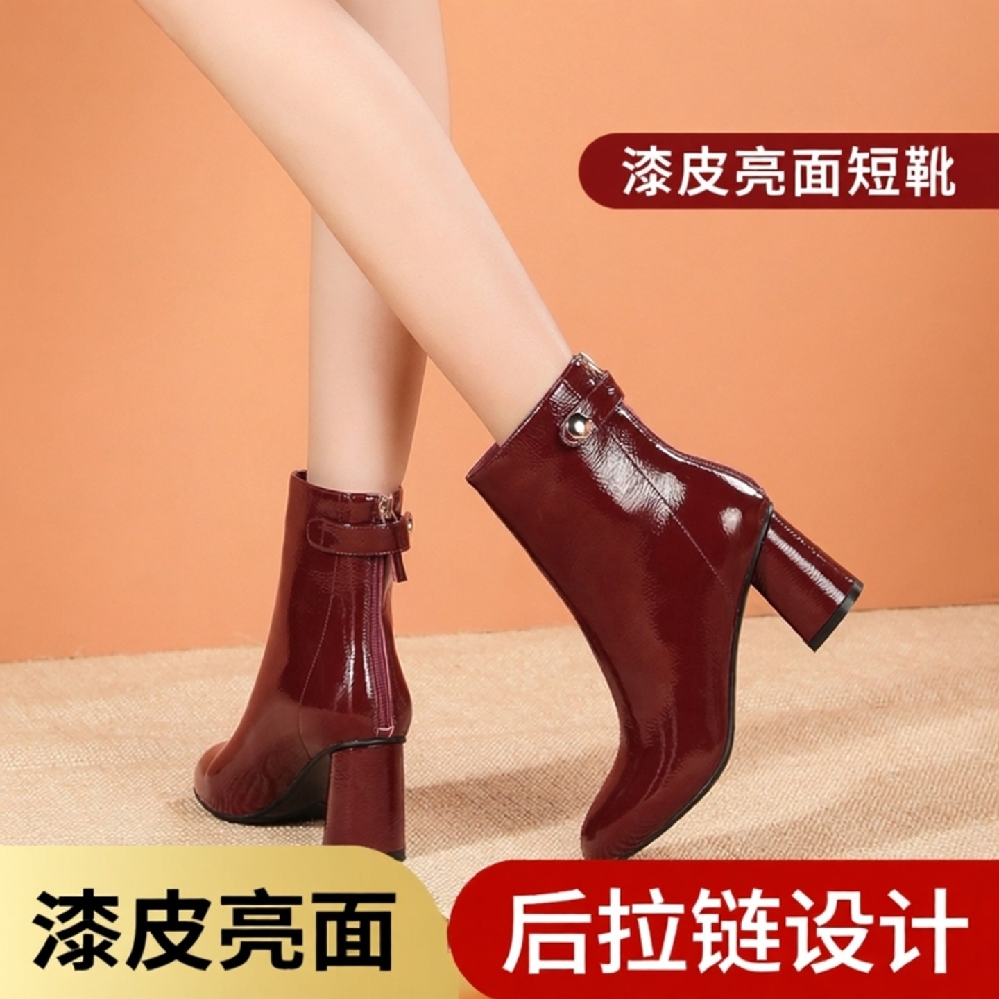 韩版漆皮亮面粗跟短靴女春秋单靴冬季加绒后拉链高跟时装靴子大码