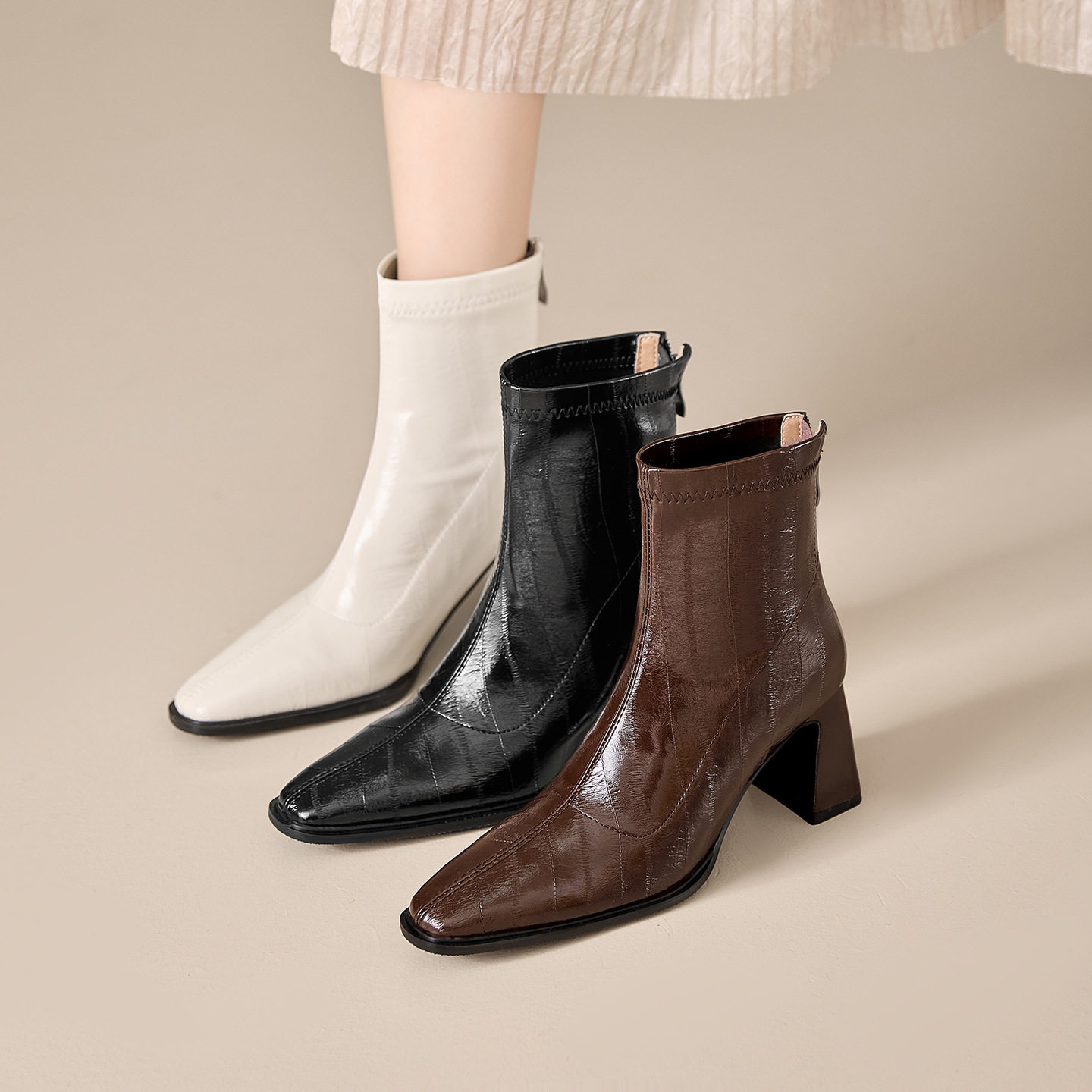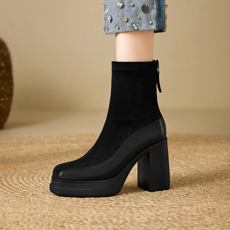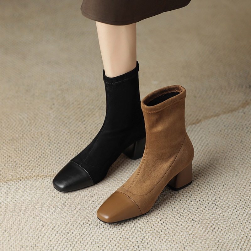 韩版拼色高跟短靴女春秋单靴真皮方头粗跟弹力靴女冬季加绒瘦瘦靴