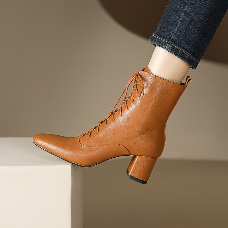 里外全皮韩版中跟粗跟短靴女春秋单靴冬季真皮方头加绒系带时装靴