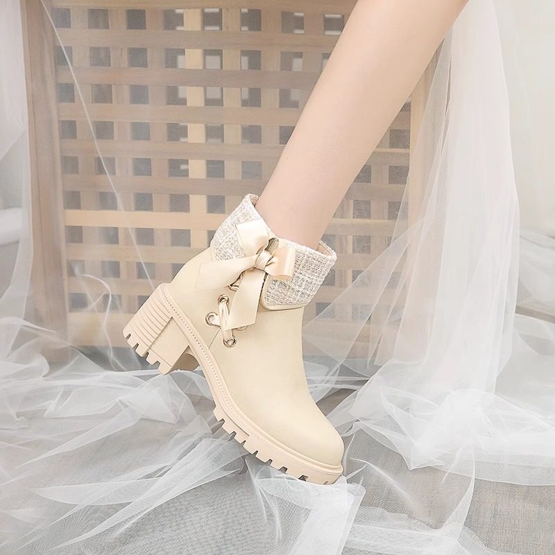 小香风短靴女2025年新款蝴蝶结粗跟女靴子韩版百搭马丁靴春秋单靴