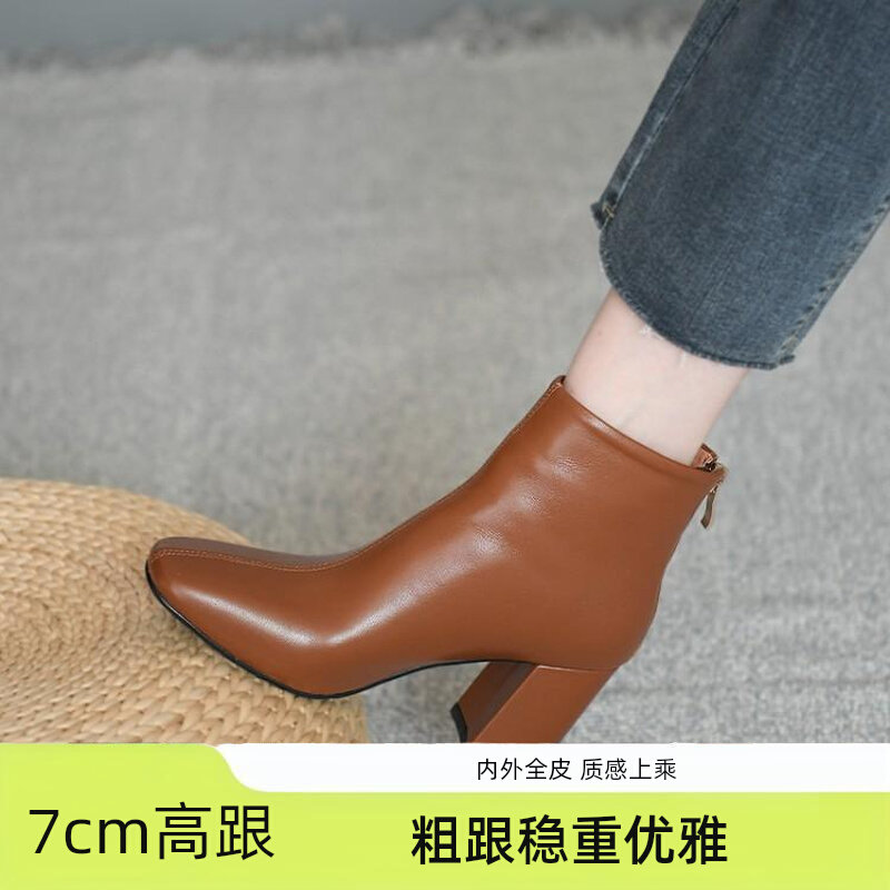 韩版后拉链短靴女秋冬季百搭瘦瘦靴真皮粗跟中跟裸靴春秋单靴棕色