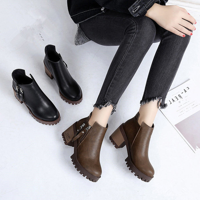2021春秋款短靴女子单靴侧拉链高跟马丁靴女圆头粗跟女靴韩版靴子