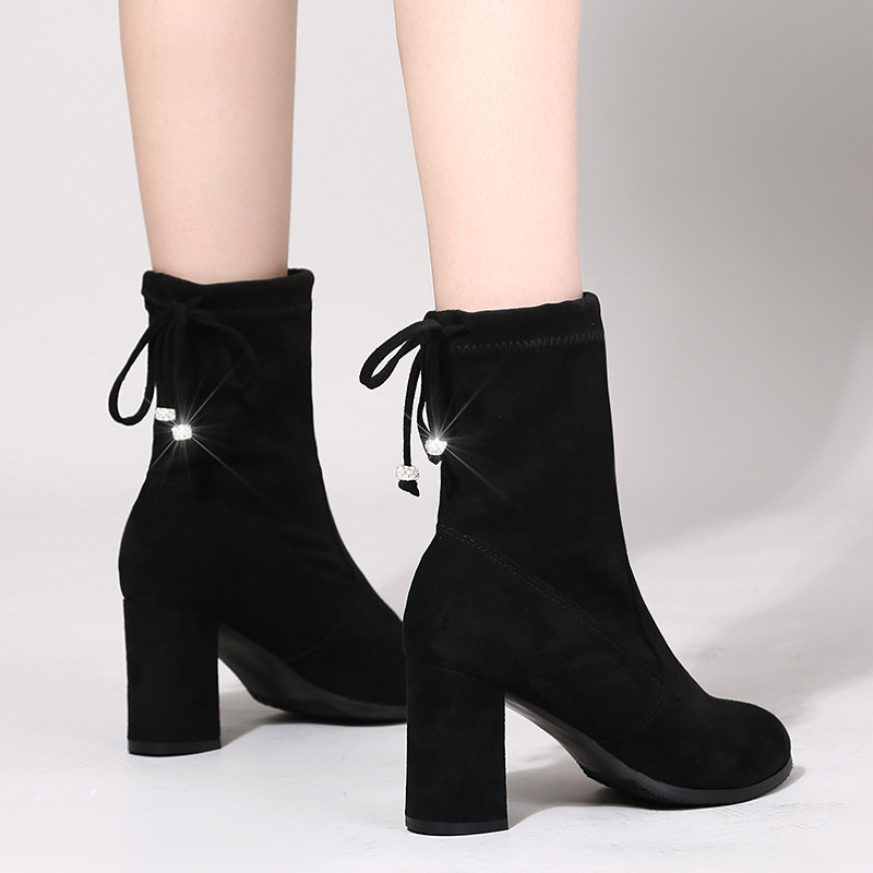 2025年新款韩版水钻弹力瘦瘦靴方头粗跟小香风高跟短靴女春秋单靴