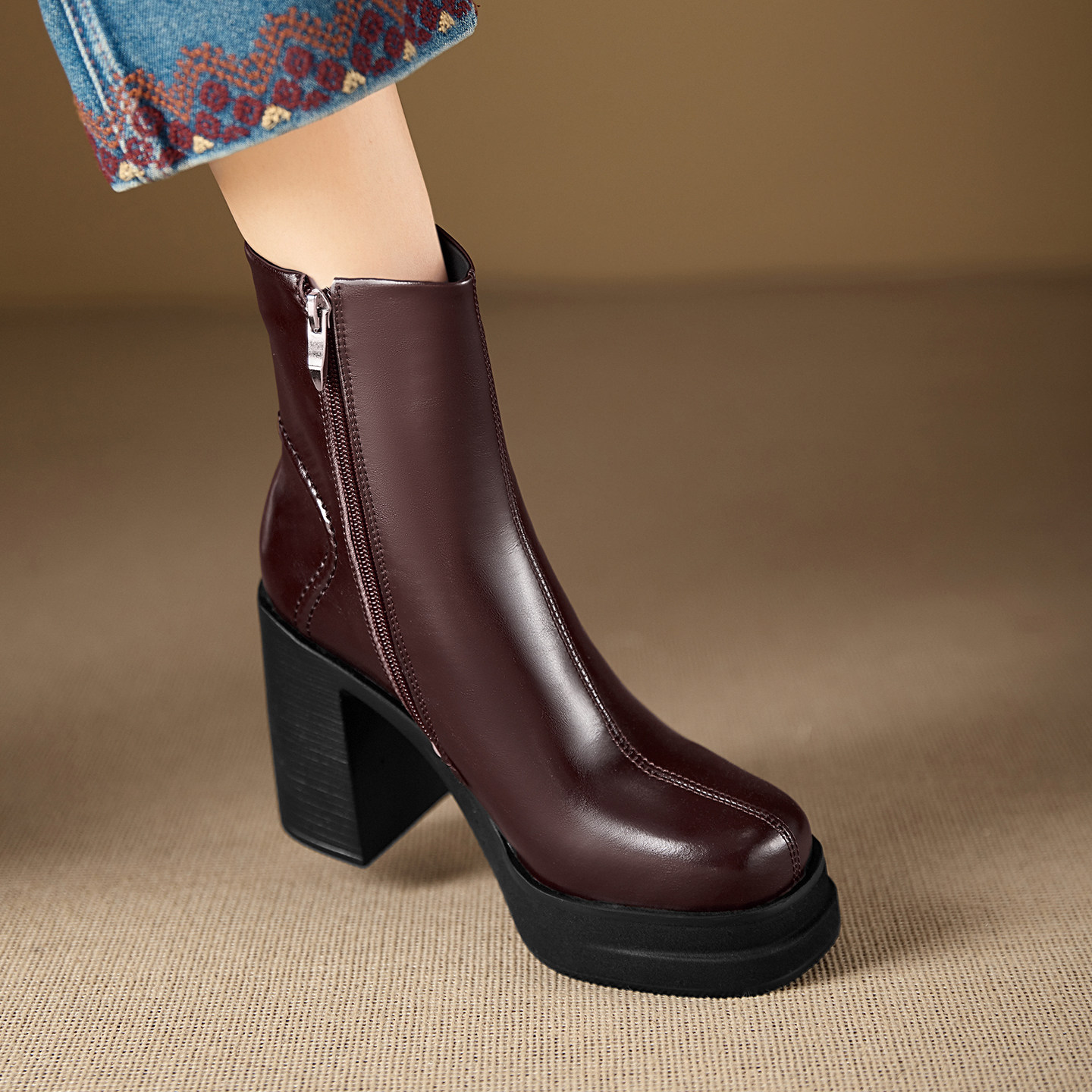 韩版方头真皮防水台粗跟短靴女春秋单靴冬季加绒后拉链高跟瘦瘦靴