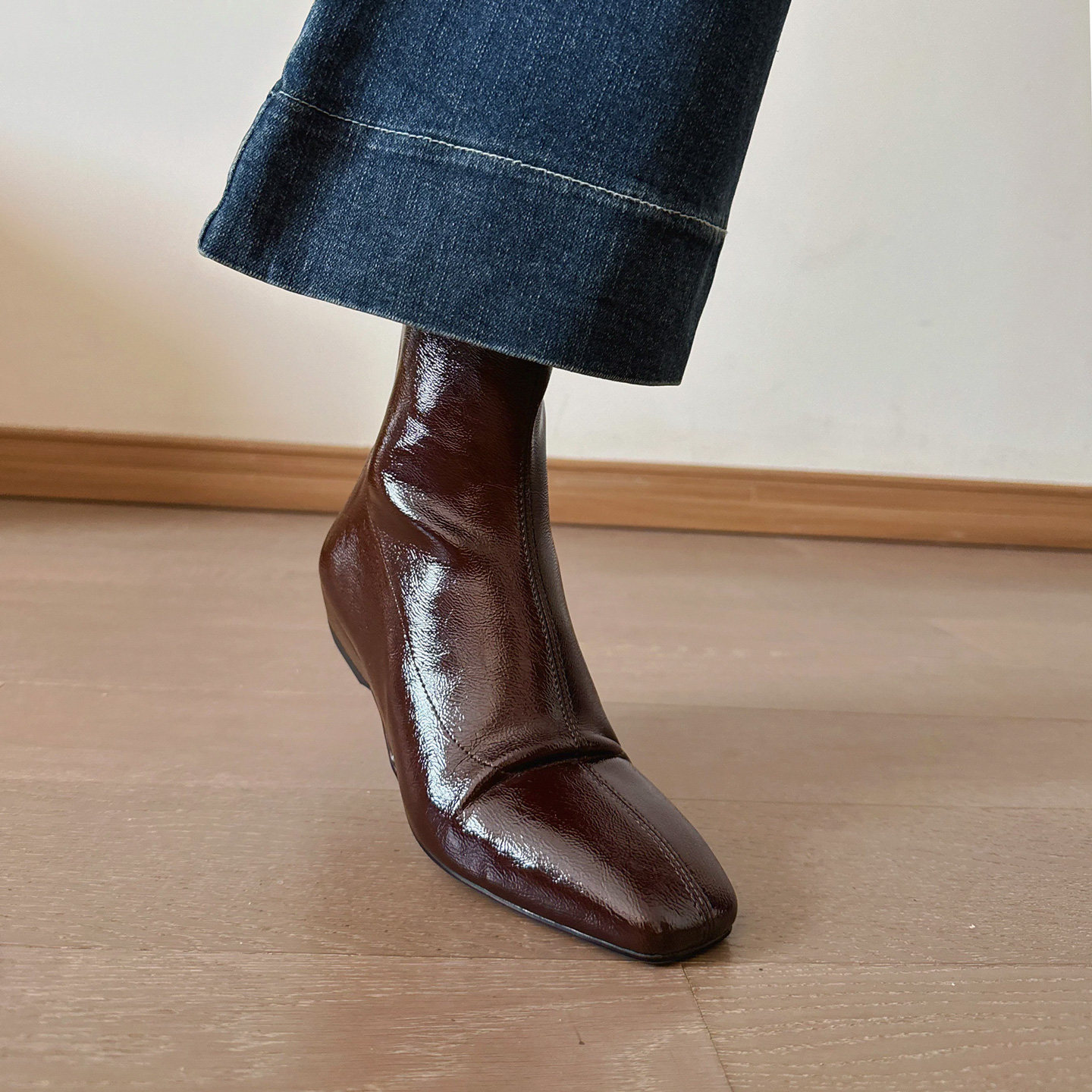 韩版亮皮软面软底包脚显瘦方头粗跟小短靴女春秋单靴子弹力瘦瘦靴