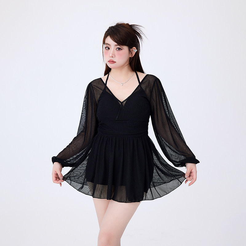 高级感大码泳衣女2025新款黑色V领性感长袖海边比基尼度假风遮肉