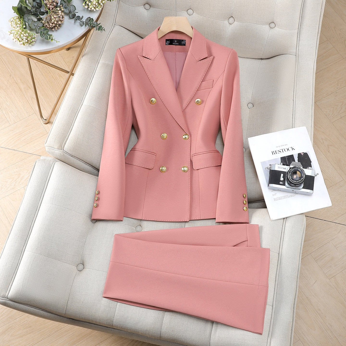 休闲时尚粉色西装套装女春秋双排扣商务通勤面试工作正装职业西服