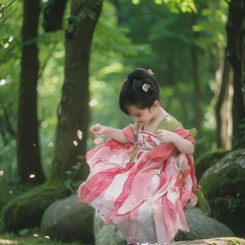 荔枝刺绣女童汉服短袖公主唐代襦裙女孩国风儿童小清新连衣裙夏季