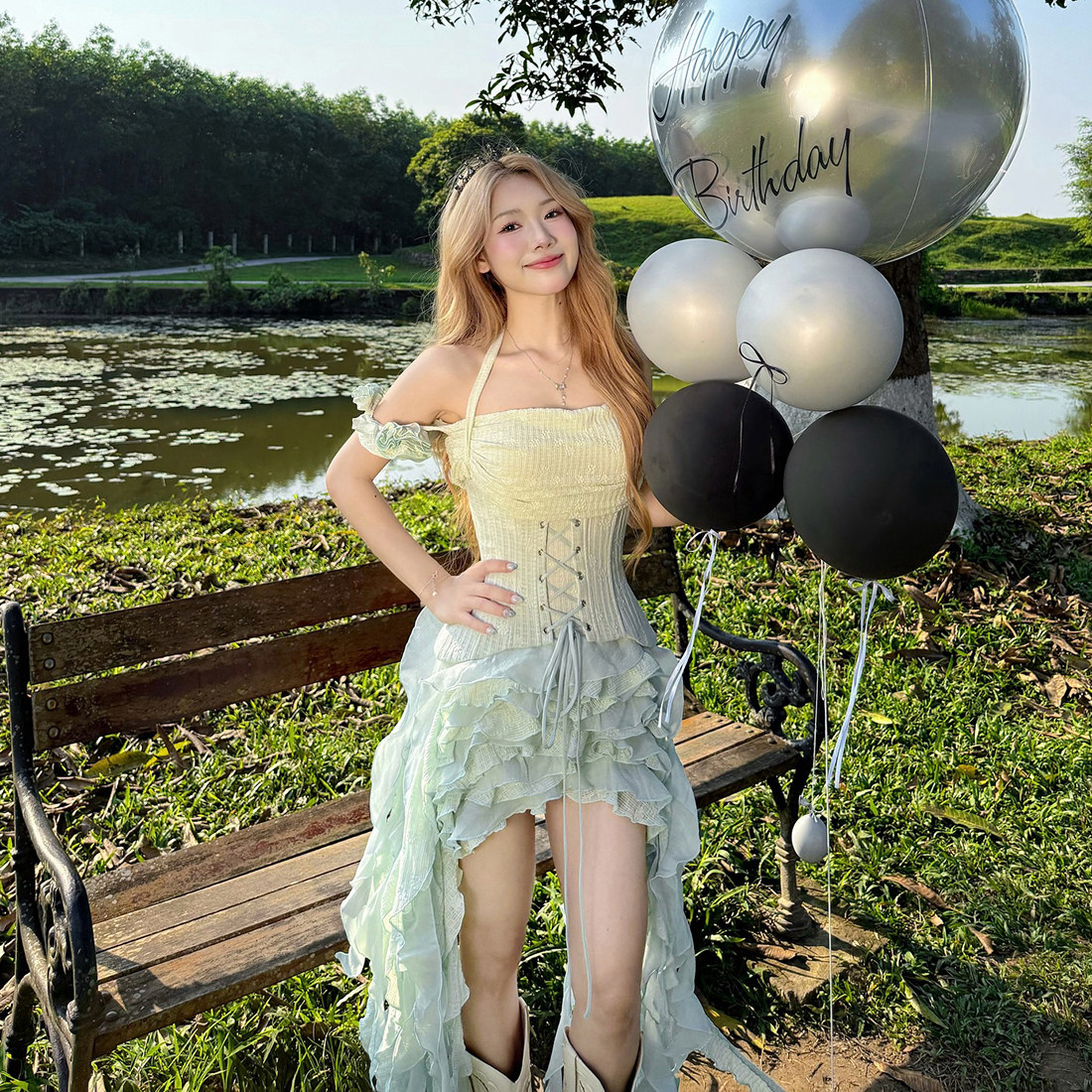 SylCue 夏日小清新绑带收腰氛围感荷叶边层次感不规则挂脖连衣裙