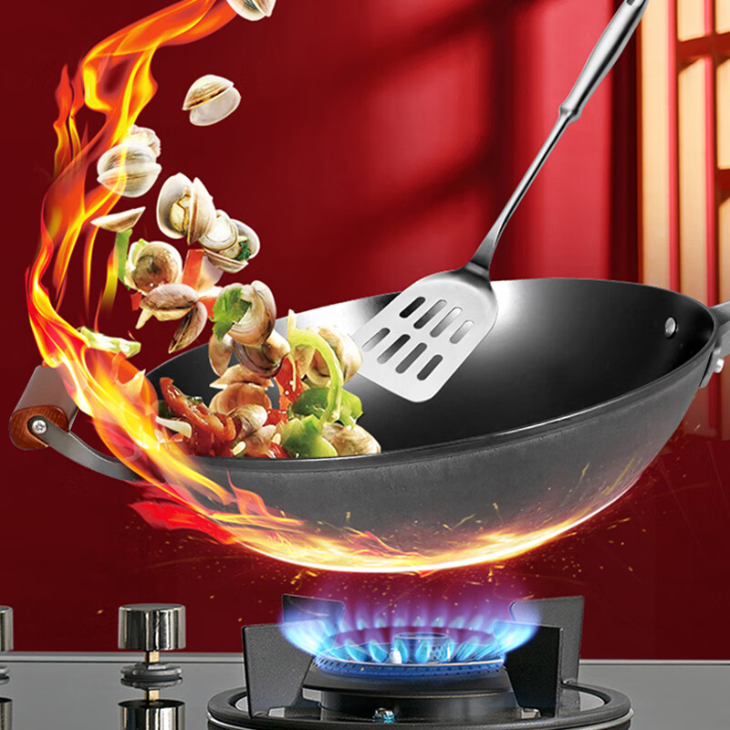 爱仕达铁锅家用炒菜锅老式无涂层炒锅熟铁锅燃气煤气灶专用免开锅