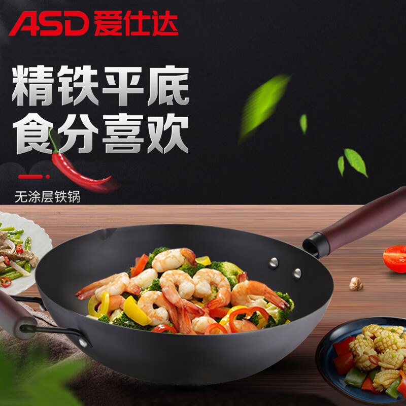 爱仕达炒锅平底铁锅家用炒菜锅精铁无涂层平底炒锅电磁炉锅燃气灶