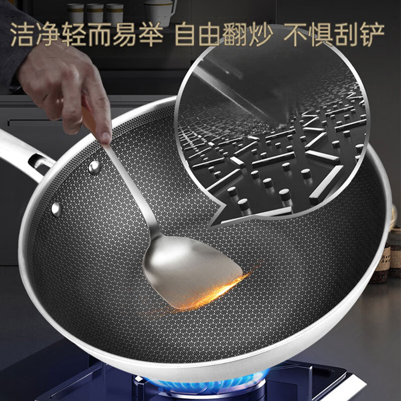 爱仕达炒锅无涂层炒菜锅304不锈钢蜂窝纹防粘炒锅燃气灶电磁炉锅