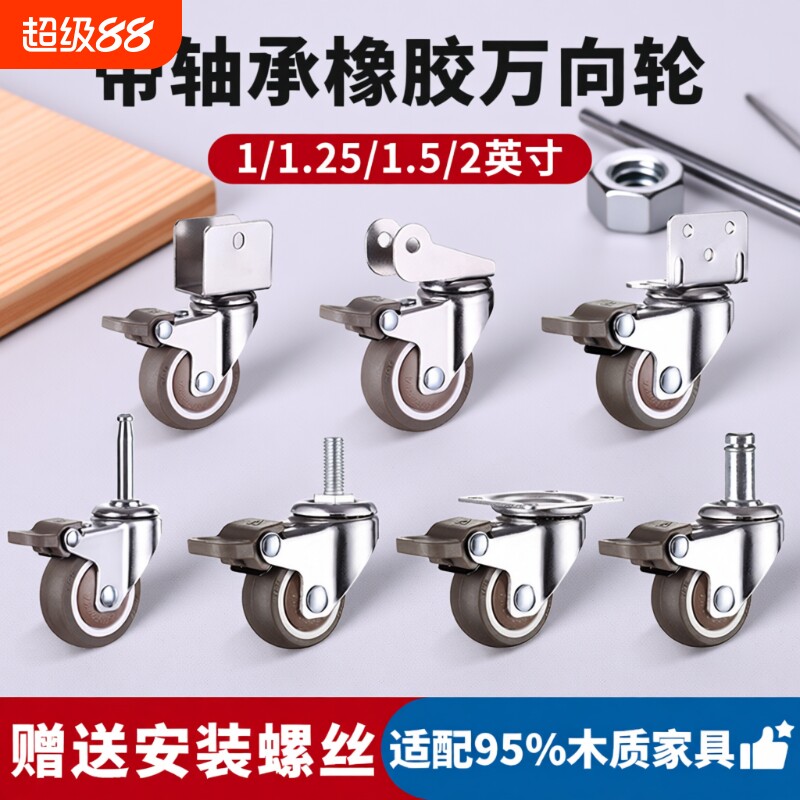 1寸滑轮滚轮橡胶轮轮子配件小万向轮静音2寸脚轮承重移动推车丝杆