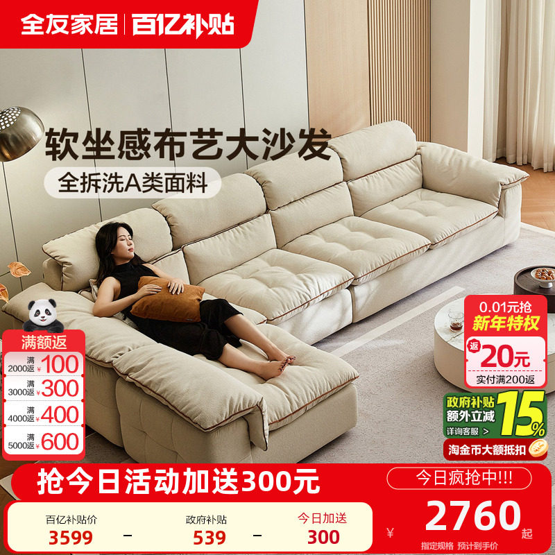 全友家居奶油风布艺沙发2025新款贵妃位转角家用客厅可拆洗沙发