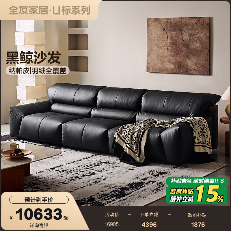 【U标·黑鲸】全友家居2025新款客厅家用黑色直排全纳帕真皮沙发