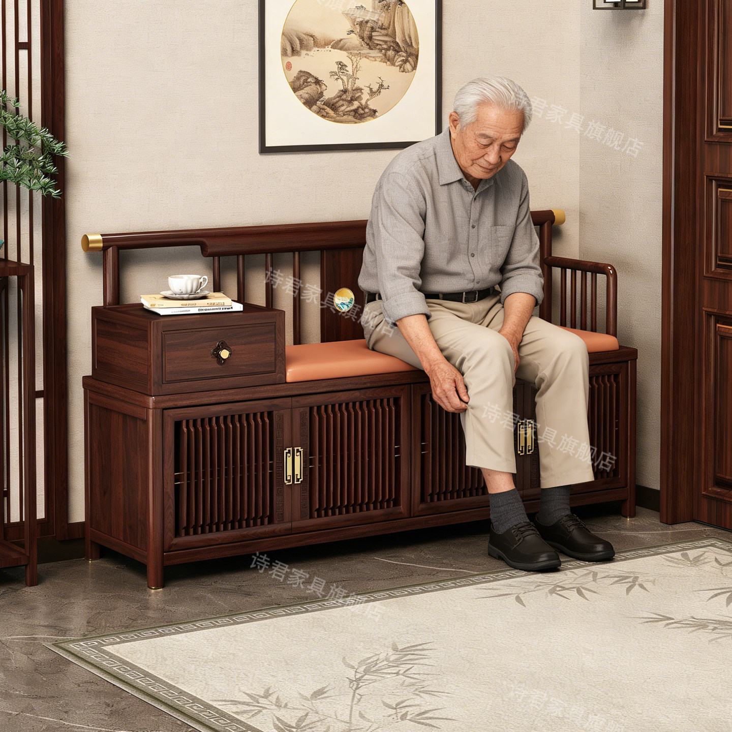 乌金木实木换鞋凳鞋柜一体家用新中式靠背鞋柜穿鞋凳一体入户可坐