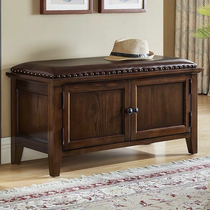 美式实木换鞋凳鞋柜家用玄关真皮进门口可坐式穿鞋凳多功能储物凳