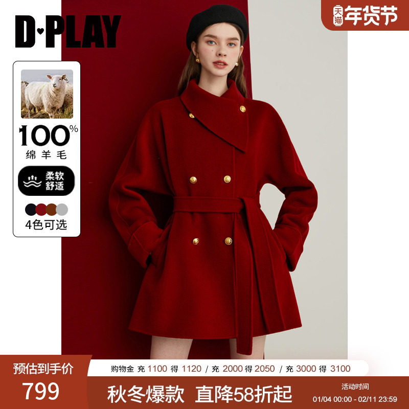 DPLAY新年战袍100羊毛红色大衣女冬季新款高级短款小个子毛呢外套