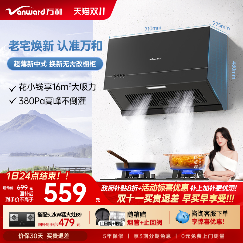 [政府补贴]万和家用厨房小型大吸力抽风机新中式抽油烟机H06C