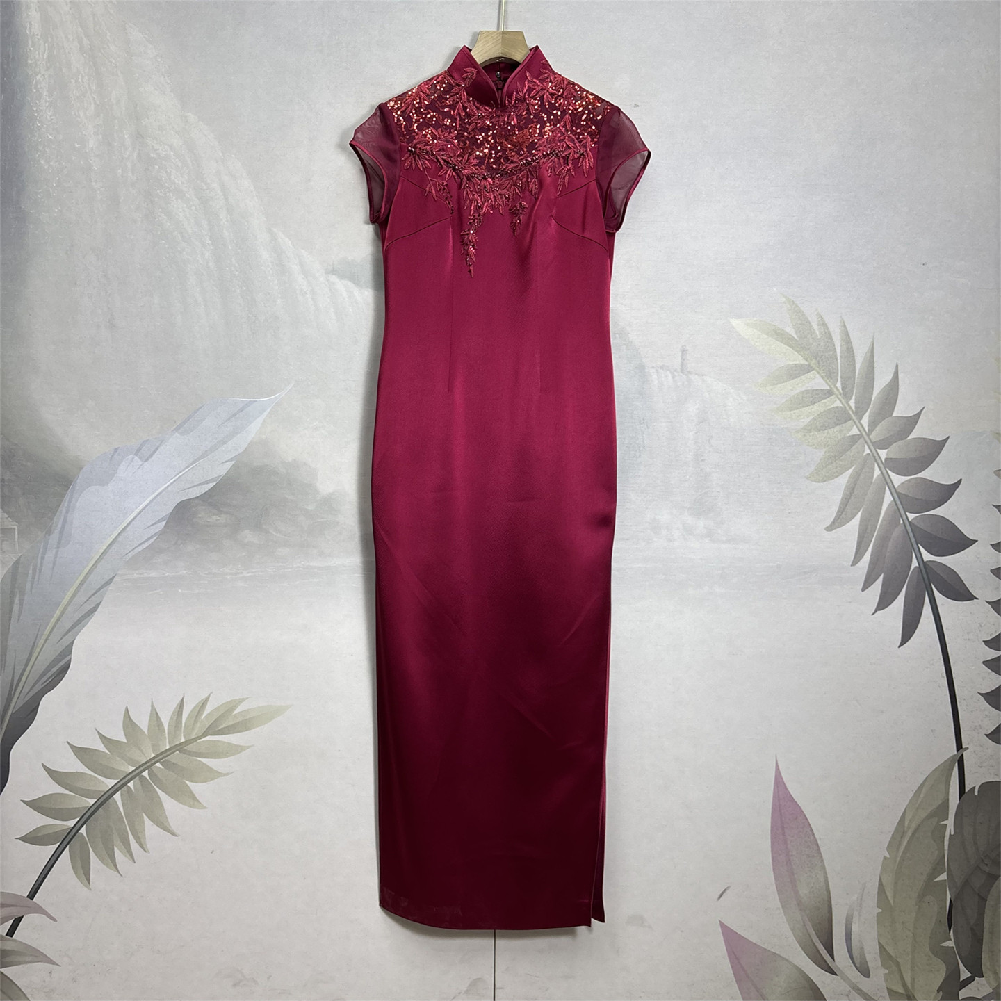 S家~高贵气质三醋酸减龄连衣裙26春年轻时尚V领重工钉珠旗袍裙女