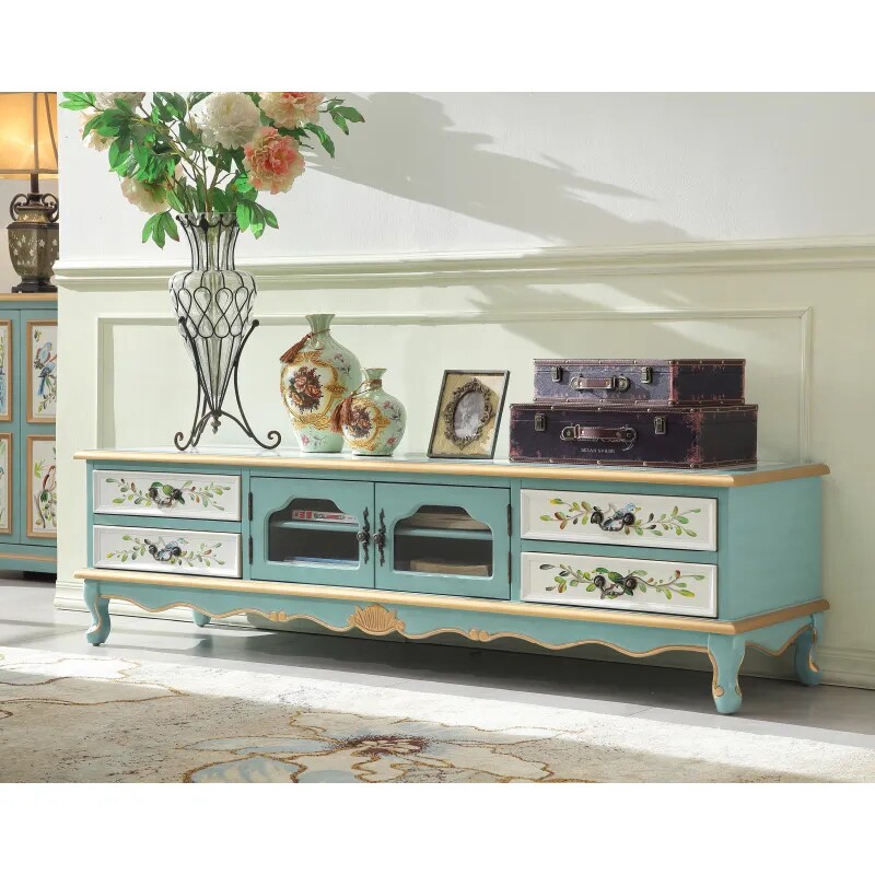 美式地中海款式彩绘实木电视柜茶几组合配套欧式乡村风地柜储物柜