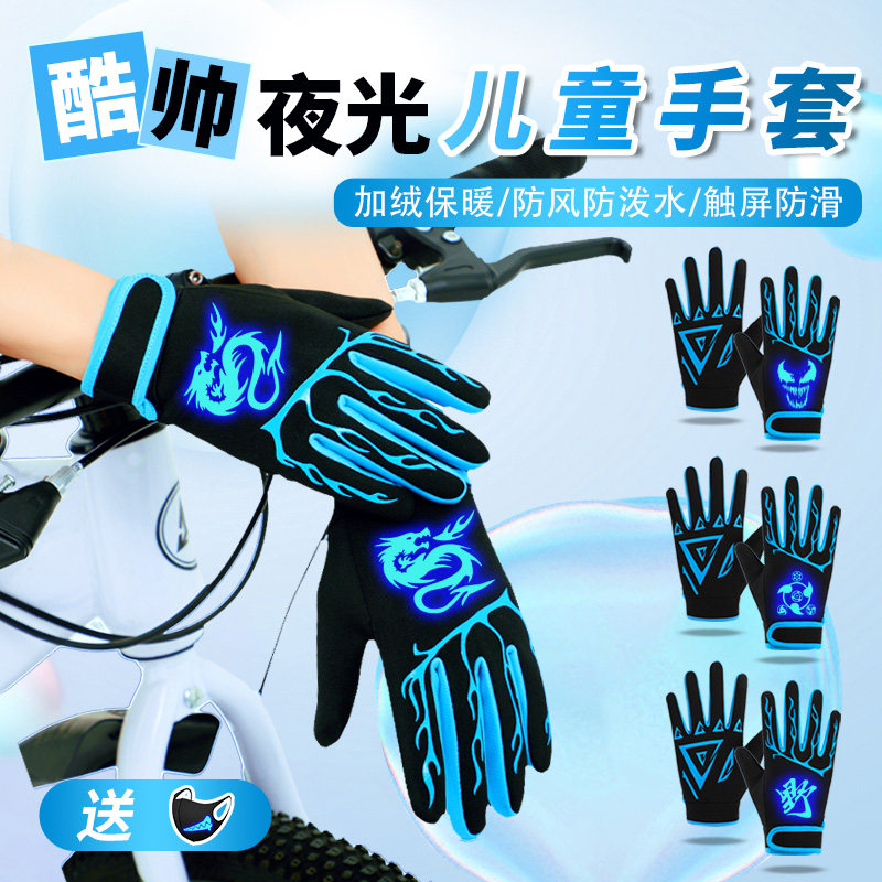 骑行手套男童冬季保暖加绒学生夜光骑自行车防水防滑儿童手套触屏