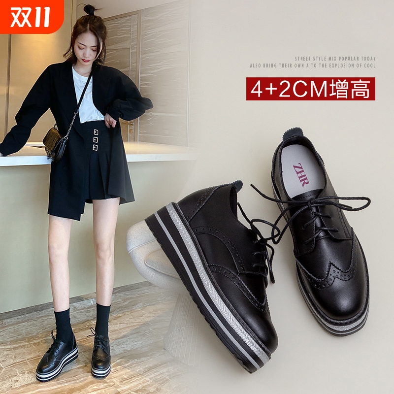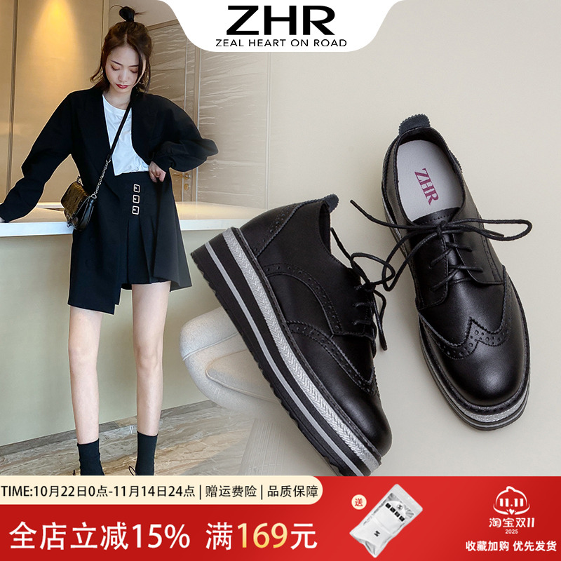 ZHR2023年夏季新款单鞋复古厚底布洛克女鞋百搭系带英伦风小皮鞋