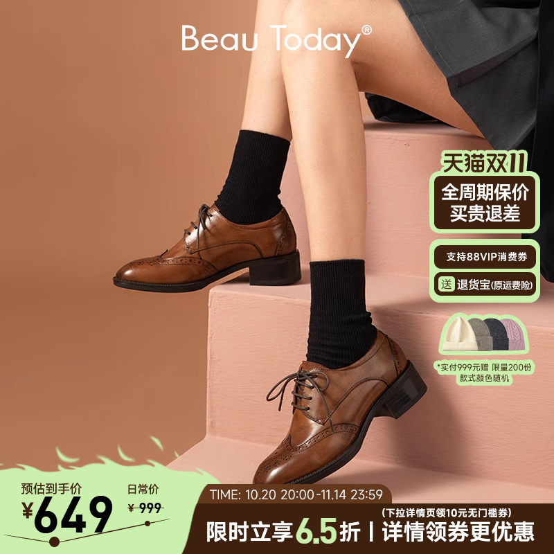 BeauToday布洛克小皮鞋女英伦厚底新款秋冬真皮乐福鞋女平底单鞋