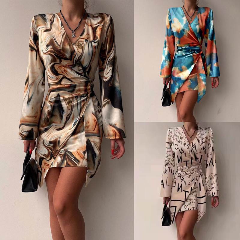 2022秋季新款欧洲站V领字母印花通勤OL修身不规则长袖连衣裙DRESS