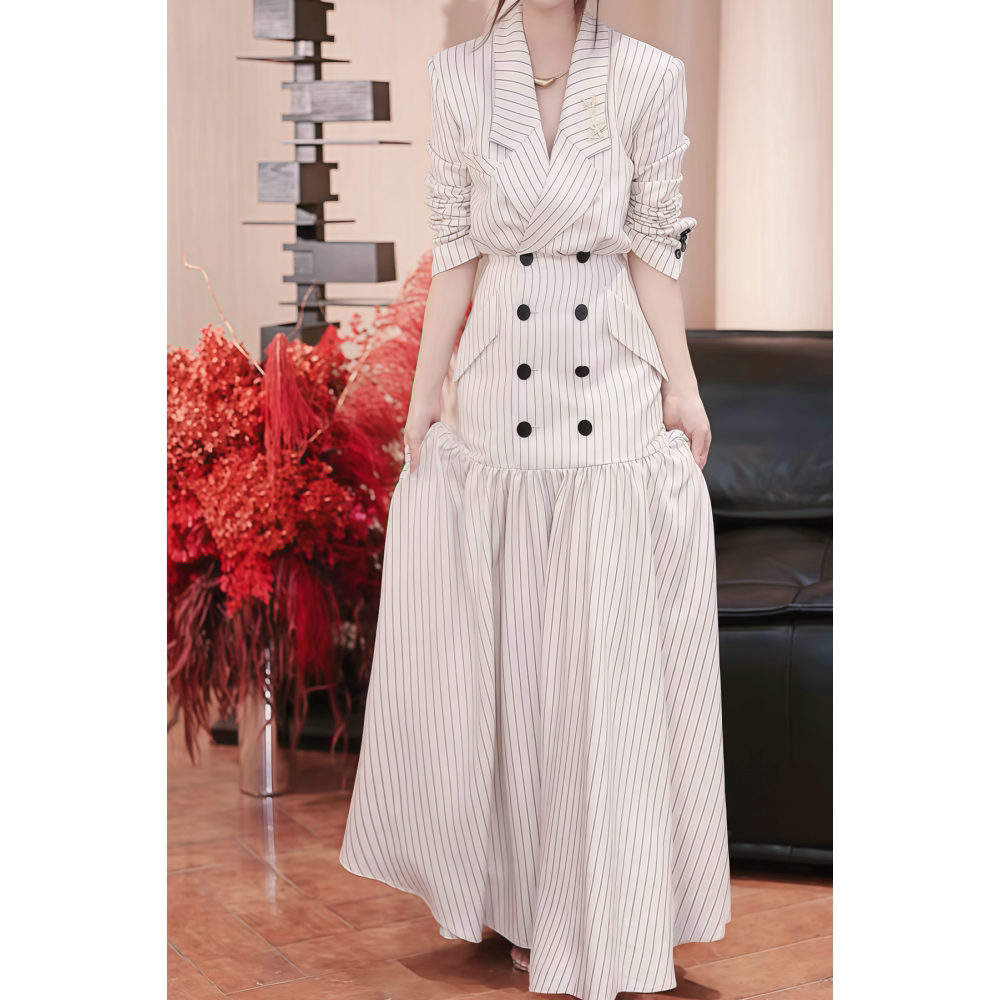 26春夏新款设计师款条纹收腰鱼尾西装连衣裙法式长款拼接OL连衣裙