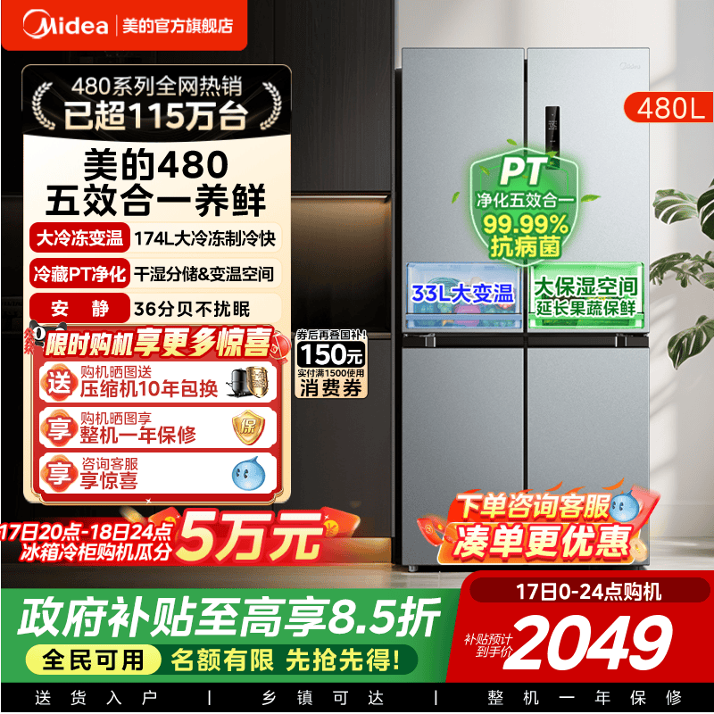 美的480L十字双开四门大容量一级风冷无霜薄嵌入家用冰箱换新补贴