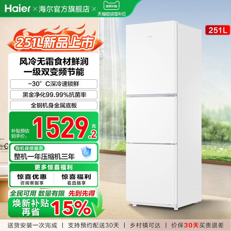 以旧换新海尔出品统帅三开门251L一级风冷无霜租房小型家用电冰箱