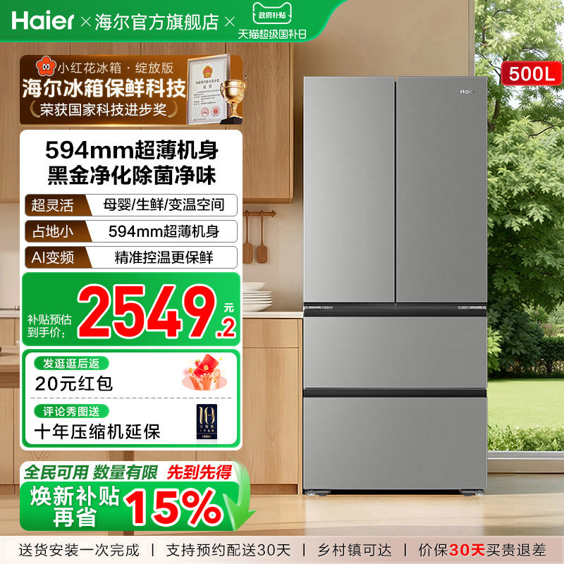 换新补贴海尔小红花500L法式多门四门一级超薄家用风冷无霜电冰箱