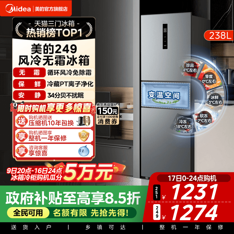 美的249三门冰箱风冷无霜变频官方超薄一级能效家用小型宿舍租房