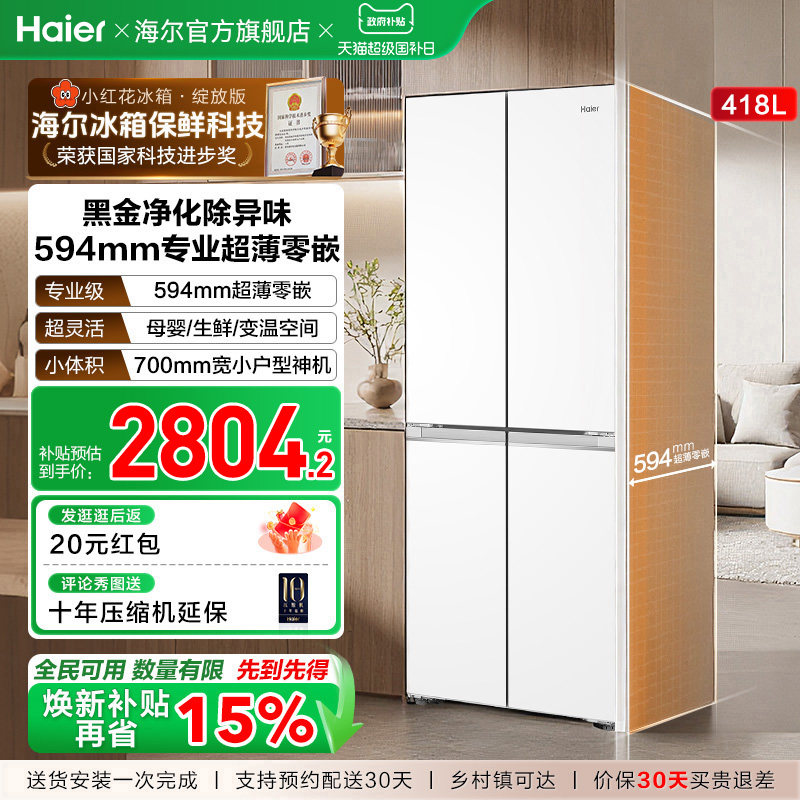 换新补贴海尔小红花418L双开四门超薄零嵌入家用风冷无霜一级冰箱
