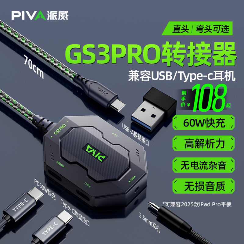 Piva派威GS3pro平板转接器typec转接口4合1转换器3.5mm耳机60W快充吃鸡游戏苹果17ipadpro手机平板耳机转换头