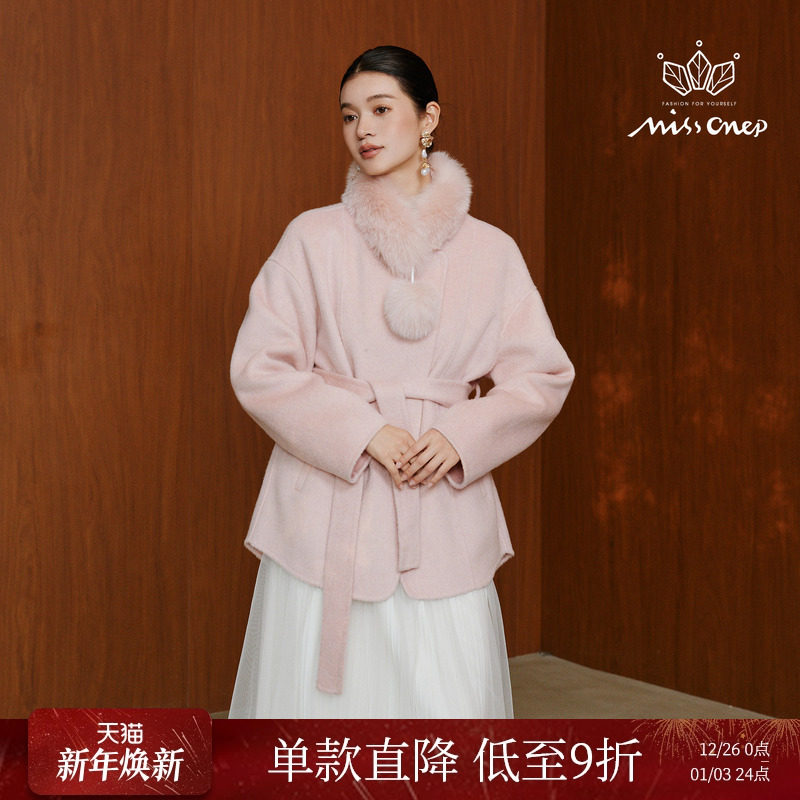 Missonep蝉【雪境语】浪漫风粉色可拆卸狐狸毛领毛呢外套女冬季