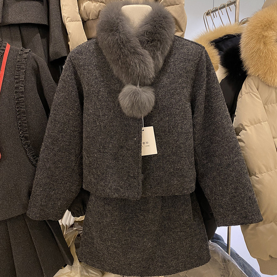 千金风时尚羽绒内胆狐狸毛领毛呢外套女冬季短款时尚套装毛球装饰