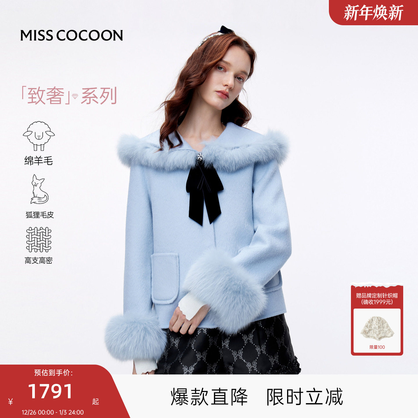 MISSCOCOON狐狸毛领毛呢外套短款绵羊毛上衣25冬新款
