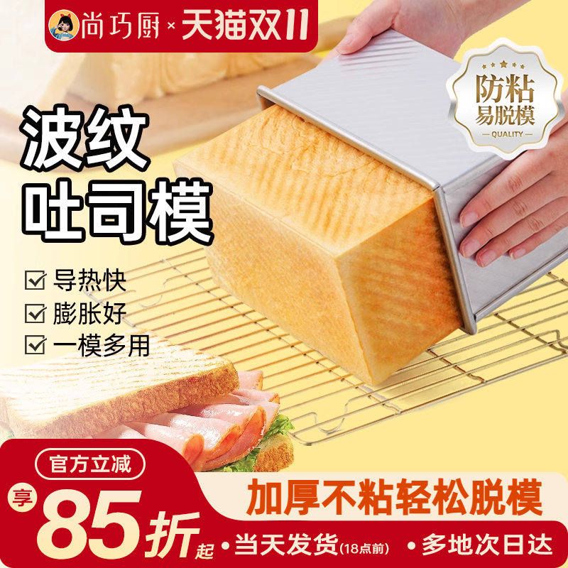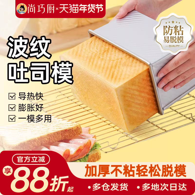 尚巧厨展艺吐司模具450g波纹烤箱家用带盖土司盒黄油面包烘焙工具