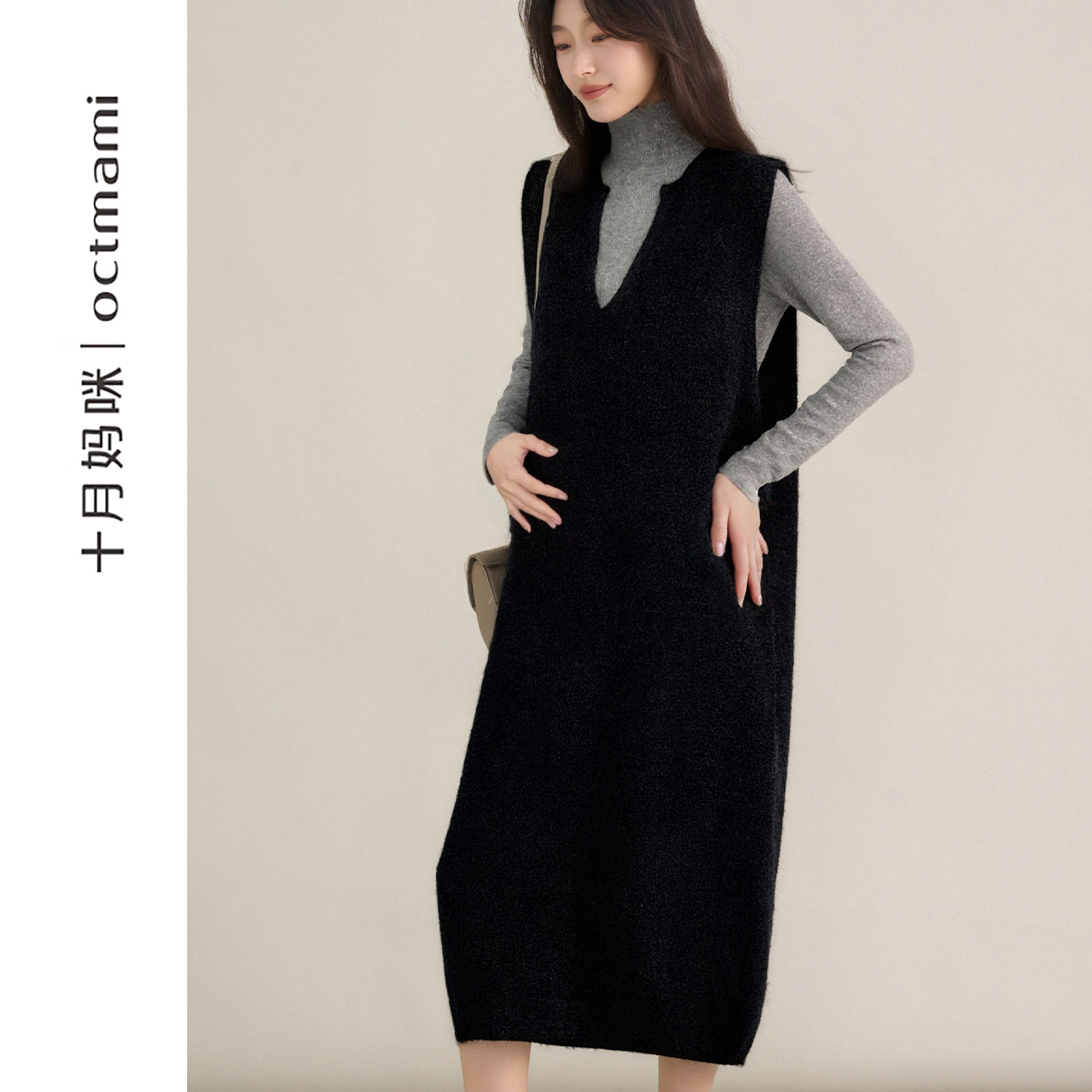 十月妈咪孕妇V领针织背心连衣裙2025新款冬季外穿内搭高领打底衣
