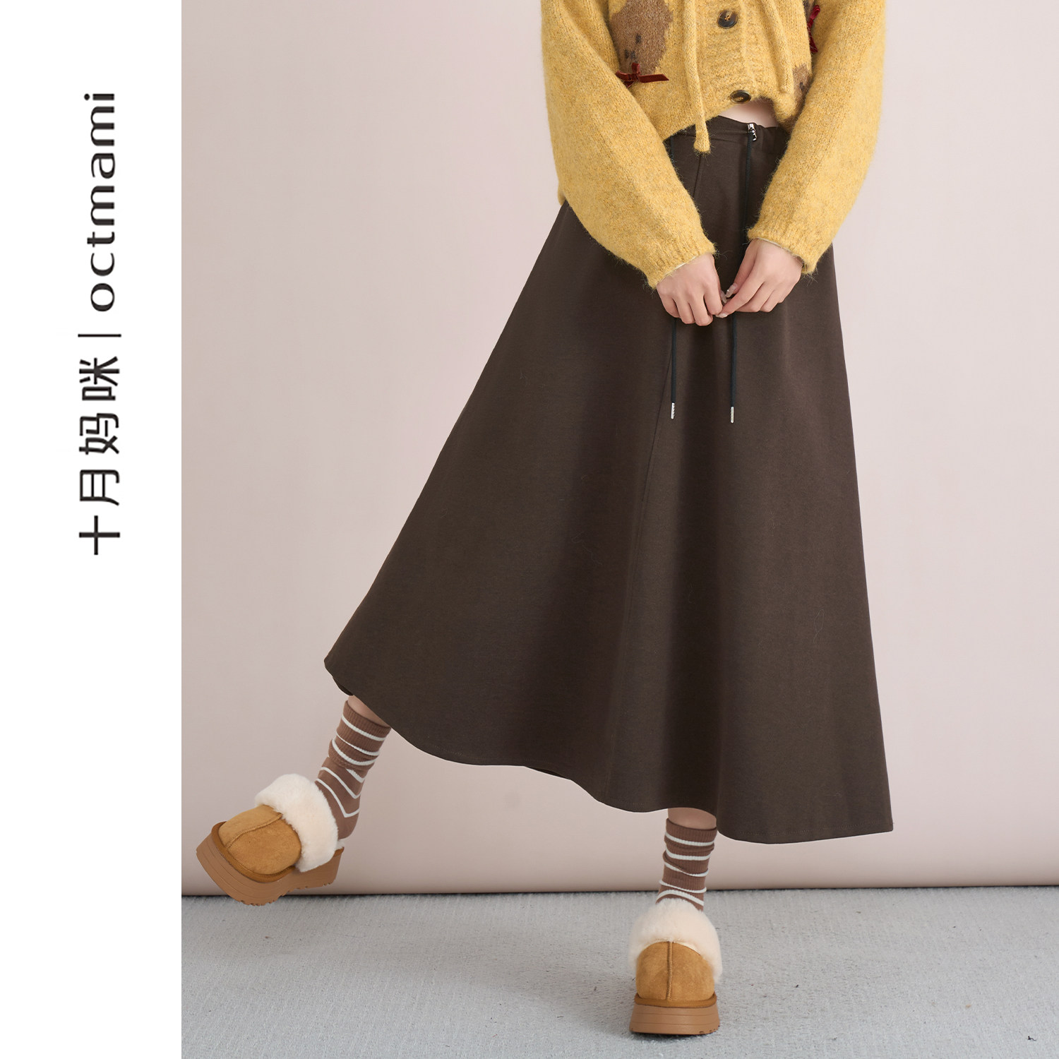 十月妈咪孕妇腰部抽绳小喇叭半身裙2025新款秋冬外穿宽松百搭裙子